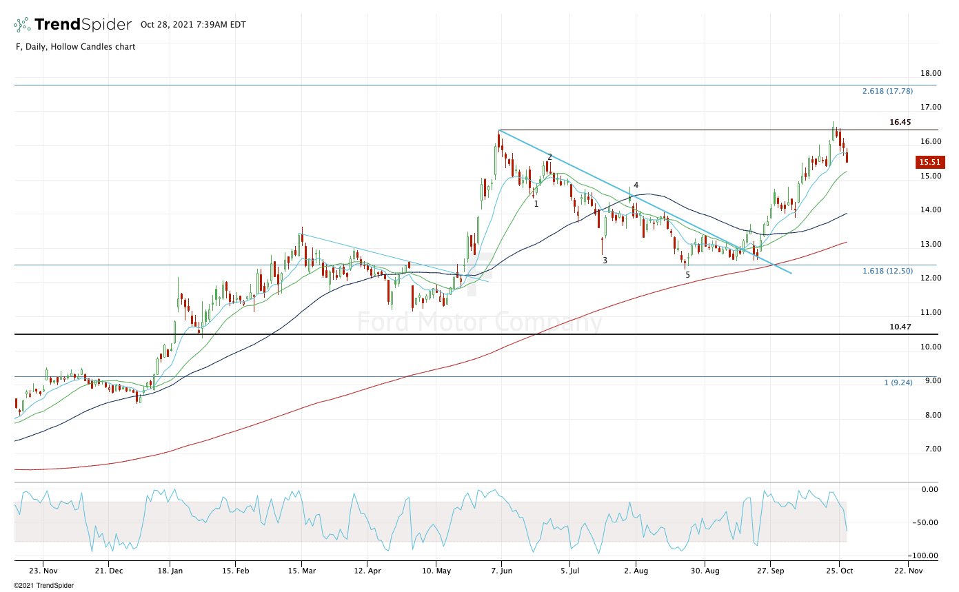 Ford reported solid earnings and is trading higher as a result. At about 9 a.m., shares are trading at $16.85, up 8.6%. I want to see that the stock holds up over $16.45, the high from June. That level so far has been resistance, even though F was able to make new highs earlier this month.